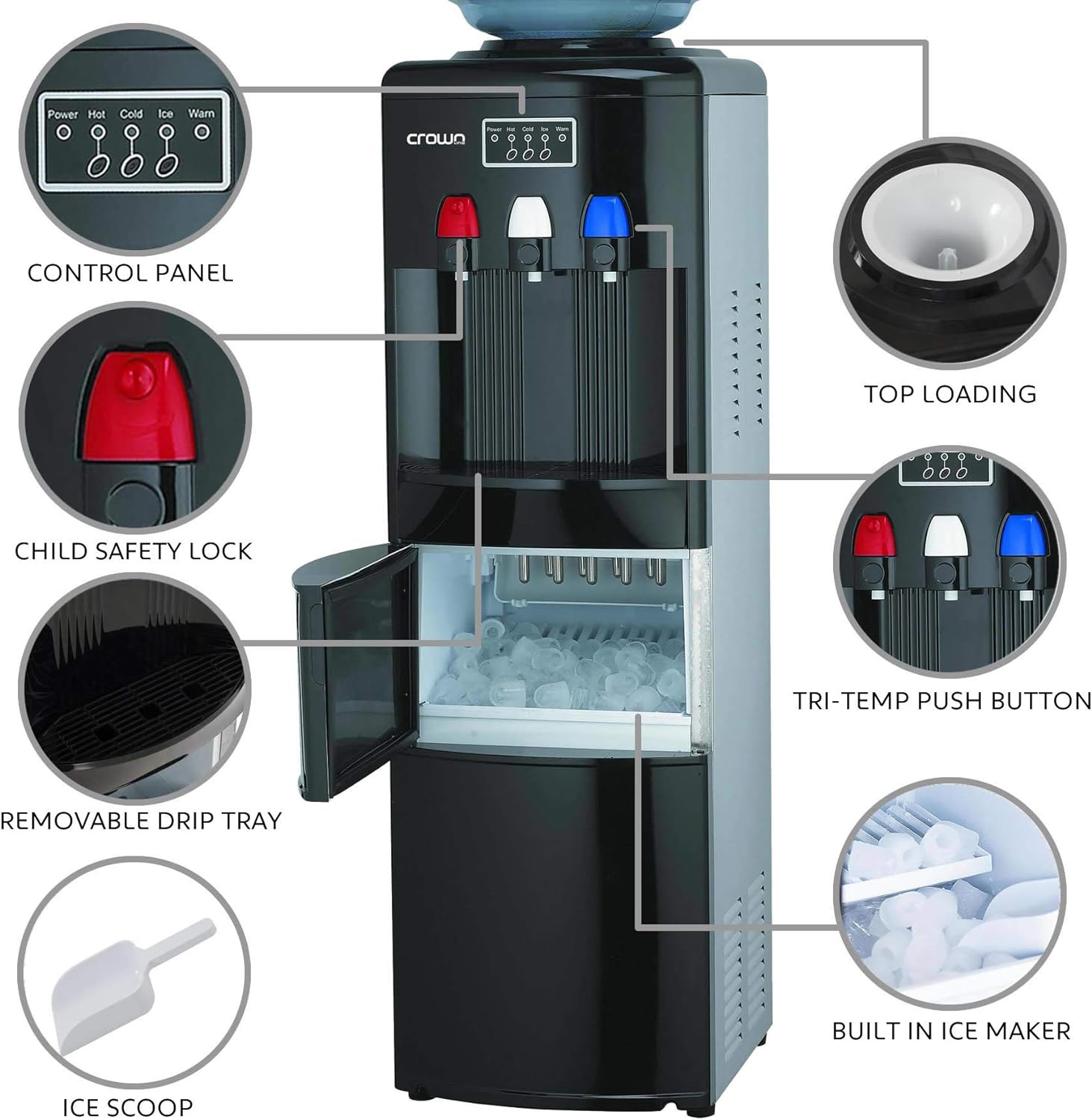 - Top-loading water dispenser with ice maker.